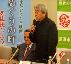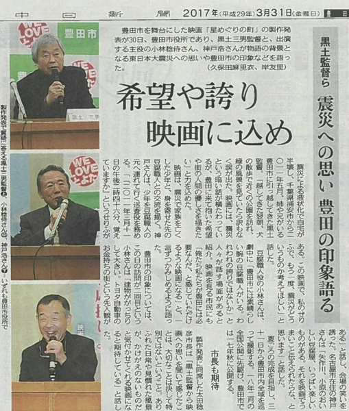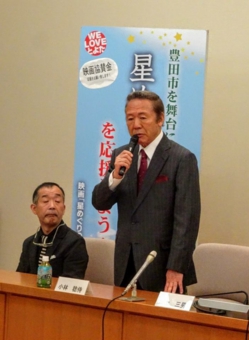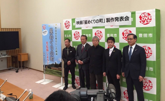 2017年3月30日、クランクインを明日にひかえ、豊田市役所にて「星めぐりの町」制作発表会が開催されました。黒土三男監督、主演の小林稔侍さん、出演の神戸浩さん、太田豊田市長、三宅豊田商工会議所会頭が出席して開催されました。